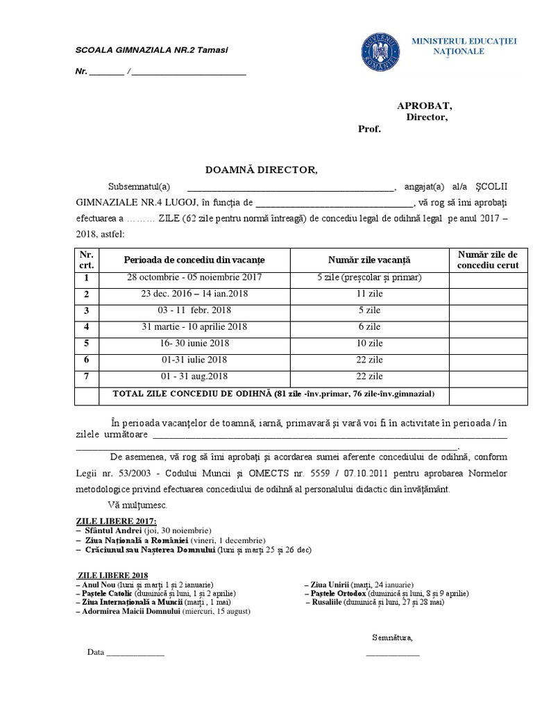 vizitati articolul complet aici : https://kabsdgh.blogspot.com/2021/03/cerere-tip-pentru-concediu-de-odihna.html De asemenea, la stabilirea duratei concediului de odihna anual, perioadele de incapacitate temporara de munca si cele aferente concediului de maternitate. Potrivit codului muncii, durata concediului de odihnă este de minimum 20 de zile lucrătoare, aceasta fiind stabilită în contractul individual de muncă, în conformitate cu reglementările în vigoare. (4) la stabilirea duratei concediului de odihna anual, perioadele de incapacitate temporara de munca si cele aferente concediului de maternitate, concediului de risc maternal si.