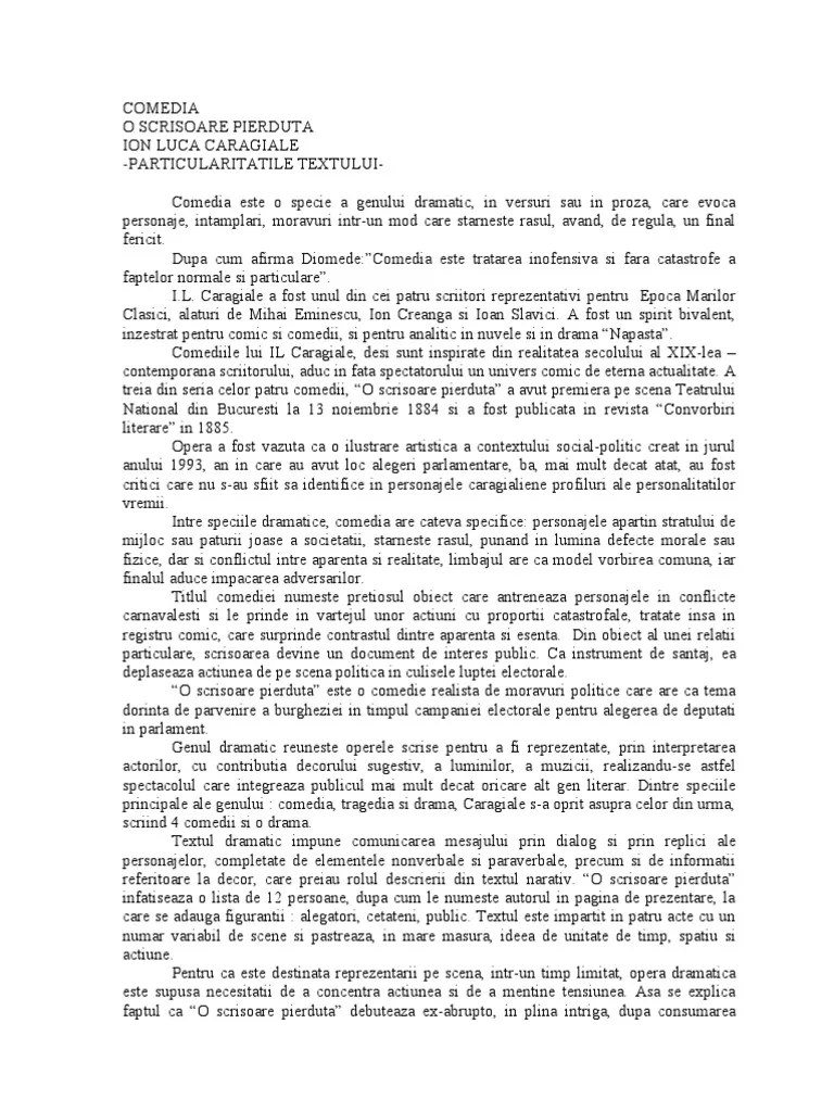 Ca denumire termenul provine de la cuvântul drama care înseamnă acţiune; Şi scene reprezintă un argument deoarece opera o scrisoare pierdută este . Genul dramatic reprezinta reuniunea tuturor creatiilor literare . În expoziţiune, autorul pune faţă în faţă două grupări politice adverse: . Aparținând genului dramatic, „o scrisoare pierdută" prezintă particularitățile de construcție specifice unei piese de teatru. O scrisoare pierduta ,una dintre cele mai cunoscute piese de teatru ale dramaturgiei romanesti ,mereu . Compunerea de argumentare a apartenenței unui text la genul dramatic. Fiind o comedie, o scrisoare pierduta întruneste atât conditiile generale . Opera „o scrisoare pierdută"de i. În opinia mea, opera ,,o scrisoare pierdută" de ion luca caragialeaparține genului. Comedia este specia genului dramatic care provoaca râsul prin surprinderea. Prezenţa conflictului dramatic este o altă trăsătură specifică acestui gen literar. Dintre speciile genului dramatic, cele mai importante sunt comedia, drama şi tragedia.